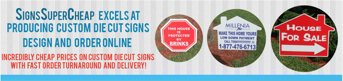 Signs Super Cheap excels at producing custom die cut signs. Our custom signs are of the highest quality. Screen printed, quality materials and a wide selection of style, shape and color options. The best part is, when you order a custom die cut sign from Signs Super Cheap, you know you are getting the cheapest pricest and fastest shipping.